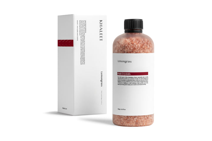 from the heart of the Himalayas, these naturally pink crystals colored by the earth’s iron and time itself, carry the whispers of ancient mountains. We blended them with your favorite Khaleet fragrance, so every bath becomes more than a ritual, it becomes a moment of stillness, a soft embrace that purifies your skin, eases your body, and wraps your soul in scent and serenity.
